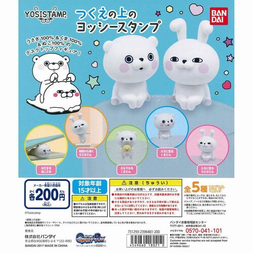 商品説明 販売会社 バンダイ 値段 200円 商品種類【全5種類】 ・はさまるぬこさま ・ふちに座るうさぎさん ・ふちに座るくまさん ・物陰から覗くうさぎさん ・ぶら下がるくまさん ヨッシースタンプ つくえの上のヨッシースタンプ設置場所について 使い方…